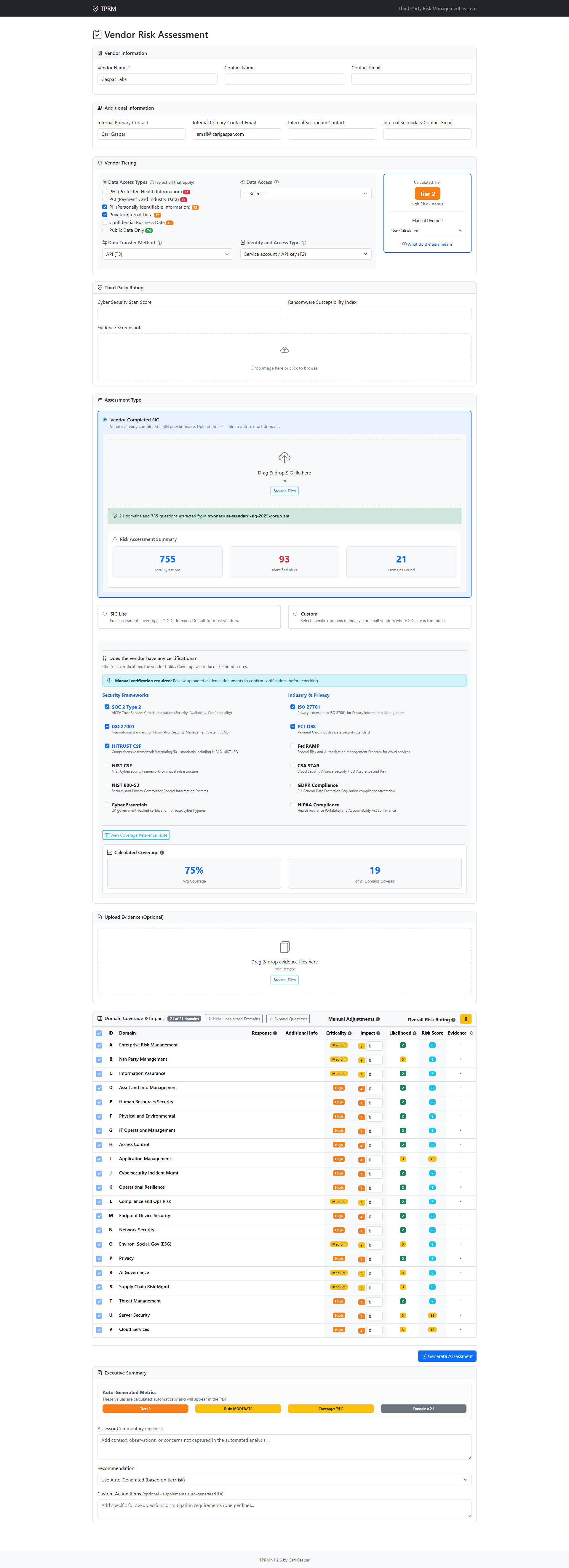 - Export a PDF risk report. The report includes the vendor tier, domain impacts, per-question findings, and a gap summary — ready to attach to a risk review package.